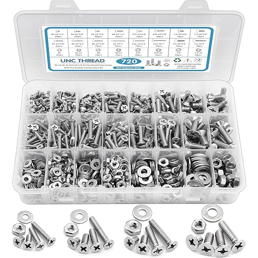 720PCS NUTS AND BOLTS ASSORTMENT KIT, MACHINE SCREWS,SATANTECH #6-32#8-32#10-24#1/4-20 STAINLESS STEEL SCREWS SET, PHILLIPS FLAT HEAD 16 SAE SIZES ASSORTED NUTS BOLTS WASHERS WITH LABELED CASE