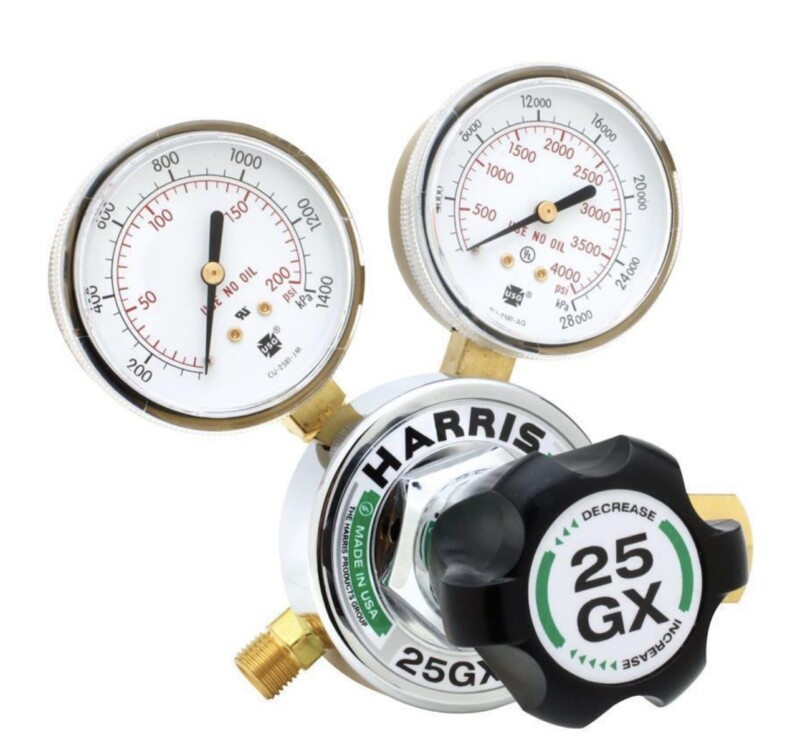 Model 25GX single-stage regulator is designed to be the next generation workhorse of the Harris industrial line. It features larger, easy-to-read gauges and an ergonomic adjusting knob that also shields the adjusting mechanism from contaminants. Conveniently packaged in clamshell for point-of-purchase display.