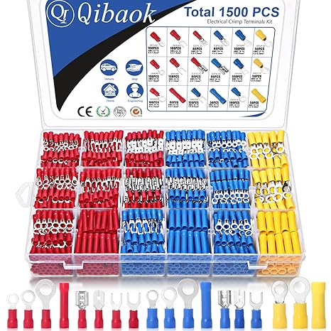 Qibaok 1500pcs Wire Connectors – Insulated Electrical Wire Terminals (Copper) – Ring, Butt, Spade, Fork Connector Kit – Red, Blue, Yellow